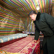习近平总书记走进村民吉地尔子家。年近花甲的吉地尔子和妻子吉色车作兴奋地邀请总书记参观他们的新居。