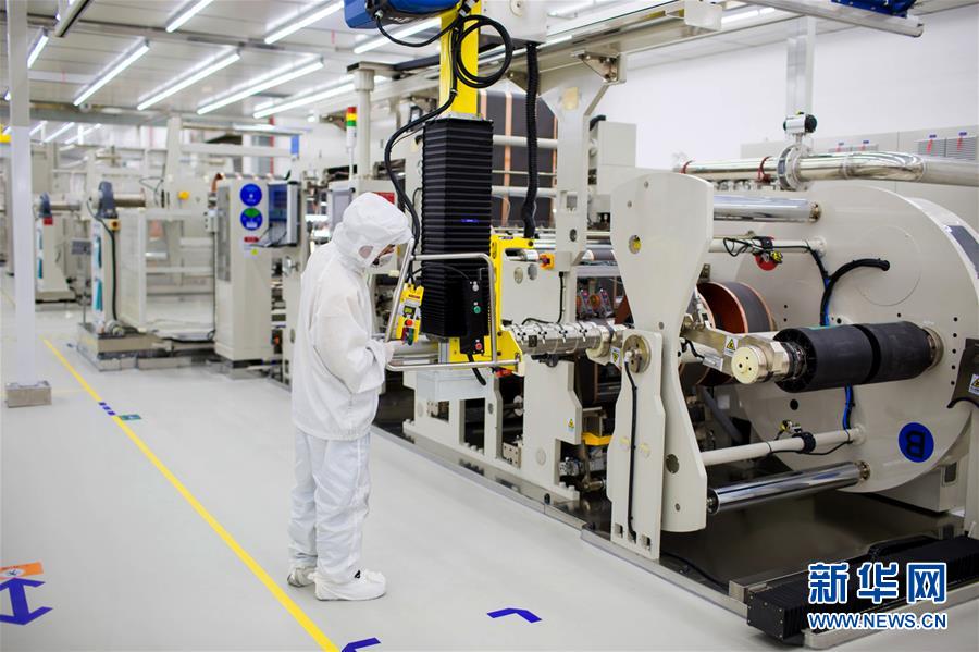 在福建省宁德市蕉城区漳湾镇,宁德时代新能源科技股份有限公司产线工人在洁净自动化电芯生产车间工作(资料照片)。新华社发