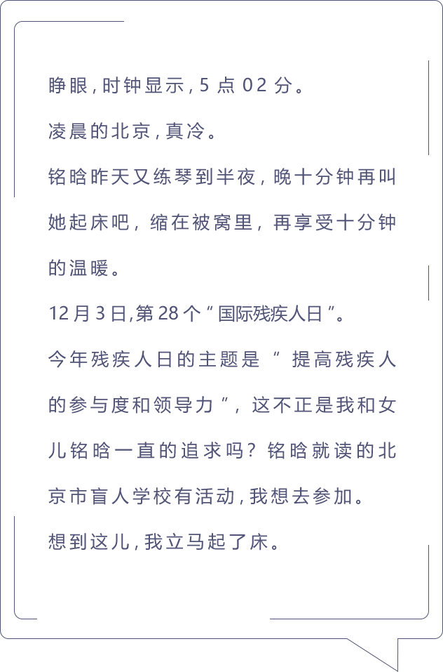 为了让铭晗有更多的学习机会,2017年我带她转学到北京市盲人学校读书。在北京学习的日子更加辛苦,好在有盲校、有老师细致入微的帮助,每一步都走得格外踏实。给铭晗和我带来信心的,有越来越完善的政策,还有越来越多的社会爱心。