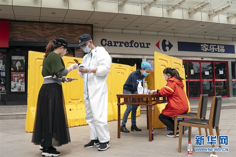 3月24日,在汉口一家家乐福超市门口,前来采购的市民在出示“健康码”,并进行测温登记后才能进入超市购物。 新华社记者 熊琦 摄
