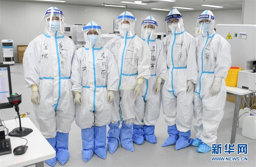 武汉雷神山医院医学检验科值班人员合影(3月4日摄)。在武汉雷神山医院里,有一群“侦察兵”,他们就是医院的检验团队,团队成员中,女性占了半壁江山。 新华社记者 程敏 摄
