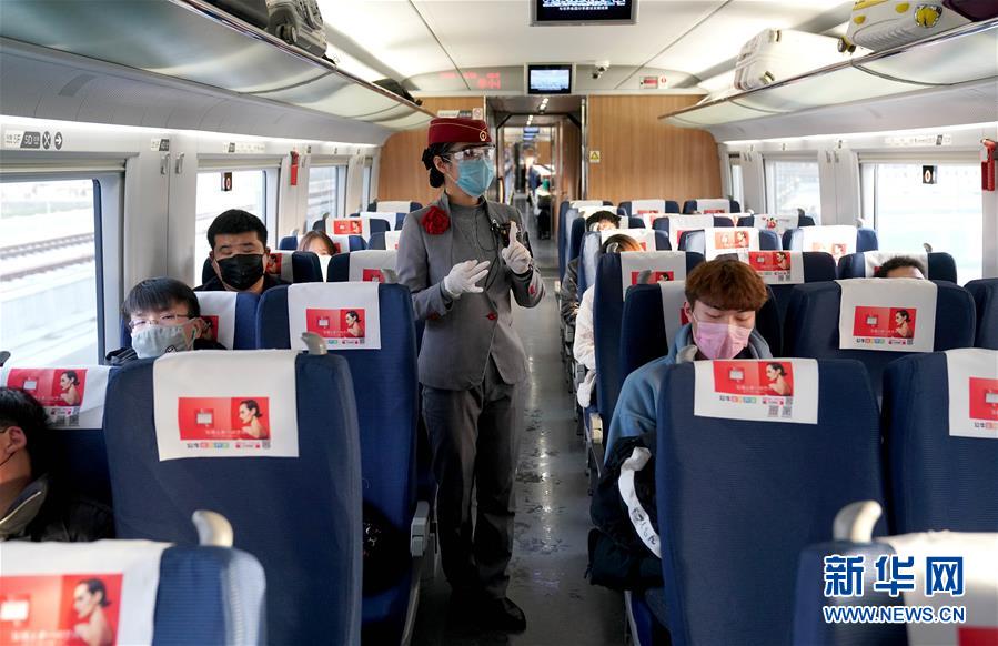 2月22日,乘务员在G3105次专列上向返岗务工人员讲解防疫注意事项。当日,来自河南安阳、新乡、周口、平顶山等地的700多名务工人员搭乘G3105次定制专列去往浙江杭州返岗复工。 新华社记者 李安 摄
