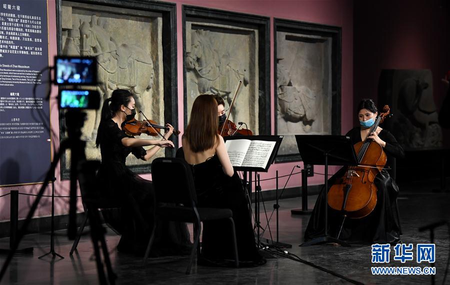 5月2日晚,通过网络直播的“云上国宝”音乐会在西安碑林博物馆奏响。这是4月28日,西安交响乐团“弦上莫奈四重奏”为音乐会彩排。 新华社记者 李一博 摄