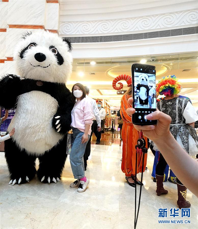 5月5日,顾客在上海环球港商场与大熊猫人偶合影。新华社记者 陈飞 摄