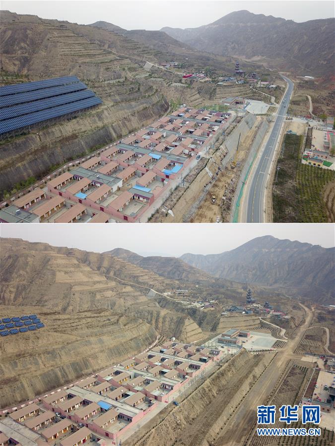 这是一张拼版照片,上图为:4月20日在甘肃省临夏回族自治州东乡族自治县高山乡布楞沟村拍摄的已通车的折红二级公路(无人机照片);下图为:2019年3月4日在布楞沟村拍摄的建设中的折红二级公路(无人机照片)。新华社记者 范培珅 摄