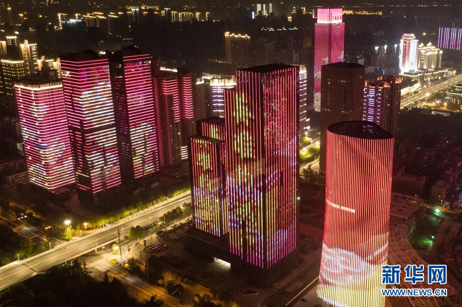 4月8日零时起,武汉市正式解除离汉离鄂通道管控措施,全市景观照明开启(无人机照片)。新华社记者 程敏 摄