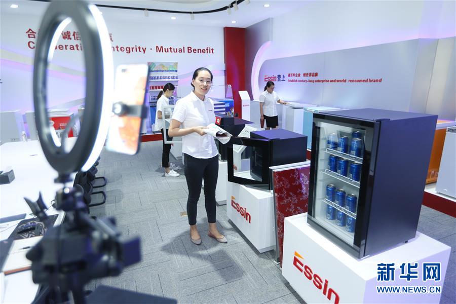 6月15日,在青岛营上电器有限公司,营销人员通过广交会直播平台推介出口到海外市场的冰箱。2020年,我国首次将广交会整体性“搬上云端”。 新华社发(梁孝鹏摄)