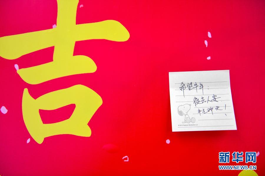 长春站候车大厅寄语墙上贴着旅客的新年寄语(1月28日摄)。新华社记者 张楠 摄