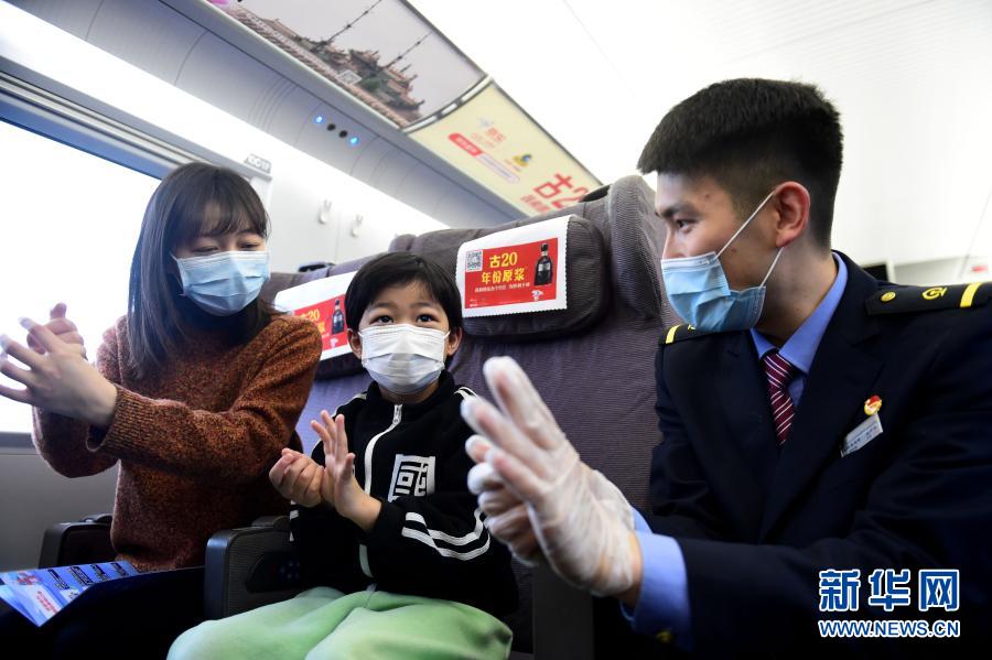 1月28日,在合肥南开往上海的G7258次列车上,中国铁路上海局集团有限公司合肥客运段的乘务人员在教小朋友正确的洗手方法。新华社记者 黄博涵 摄