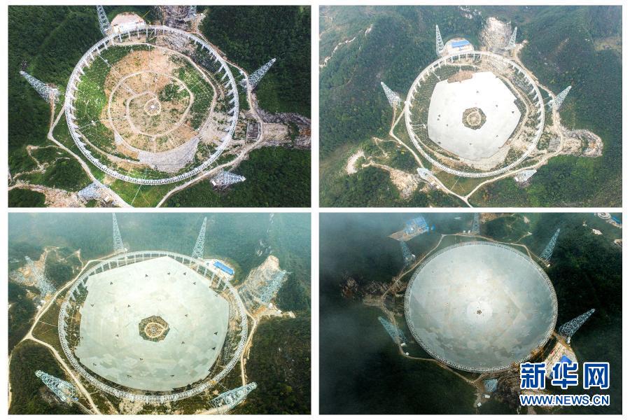 这是一张拼版照片,左上为FAST项目拼装第一块反射面板(2015年8月2日摄)、右上为FAST反射面板安装近半(2015年12月16日摄)、左下为FAST项目反射面板安装近八成(2016年3月9日摄)、右下为FAST项目反射面板安装完成(2016年7月3日摄)。新华社记者 欧东衢 摄