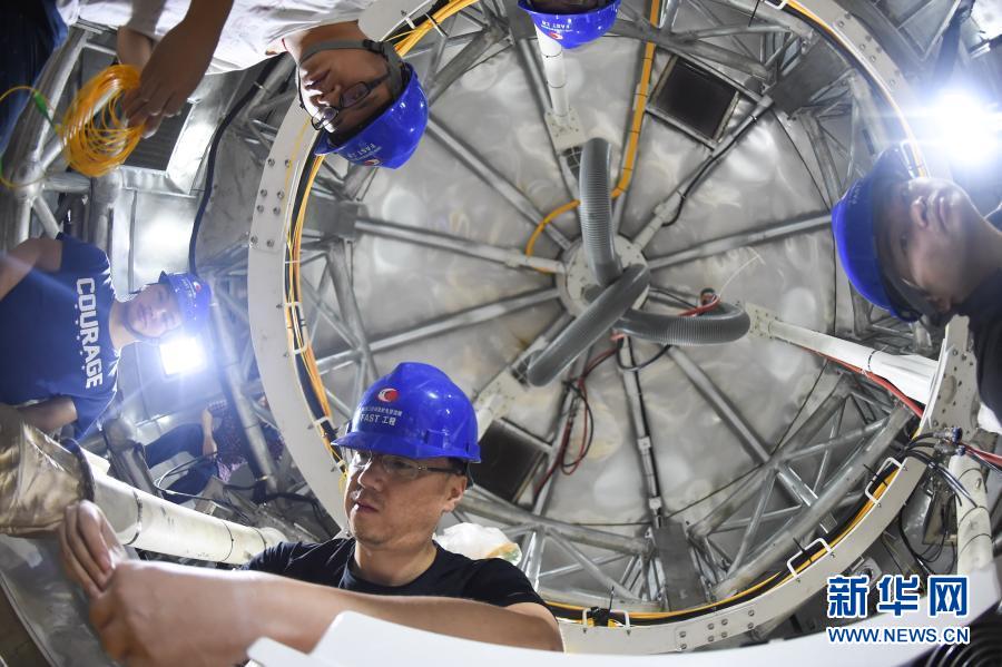 这是2017年8月10日,工作人员在FAST馈源舱内工作(检修期间拍摄)。新华社记者 欧东衢 摄
