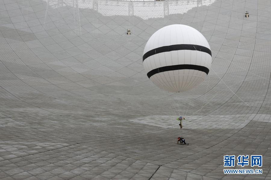 2019年8月30日,工作人员在FAST反射面板上实验“微重力蜘蛛人”方案。新华社记者 欧东衢 摄