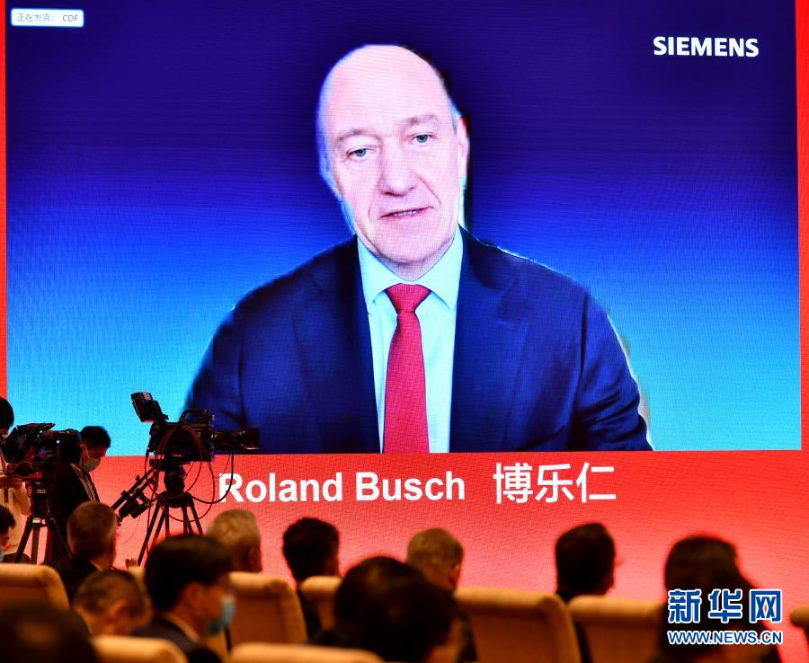 3月21日,西门子股份公司总裁博乐仁通过视频连线发言。新华社记者 李鑫 摄