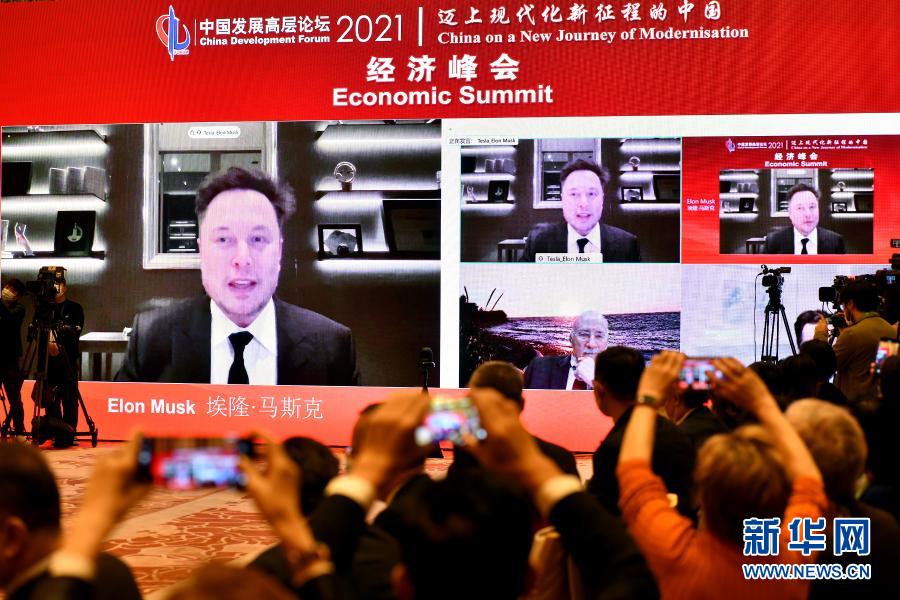 3月20日,特斯拉公司首席执行官埃隆·马斯克通过视频连线发言。新华社记者 李鑫 摄
