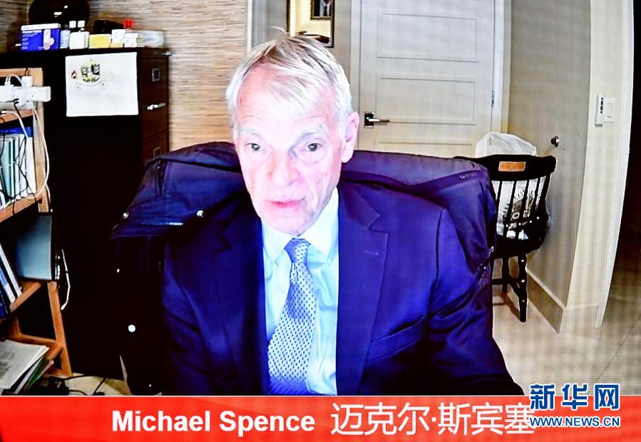 3月20日,纽约大学教授、诺贝尔经济学奖获得者迈克尔·斯宾塞通过视频连线发言。新华社记者 李鑫 摄