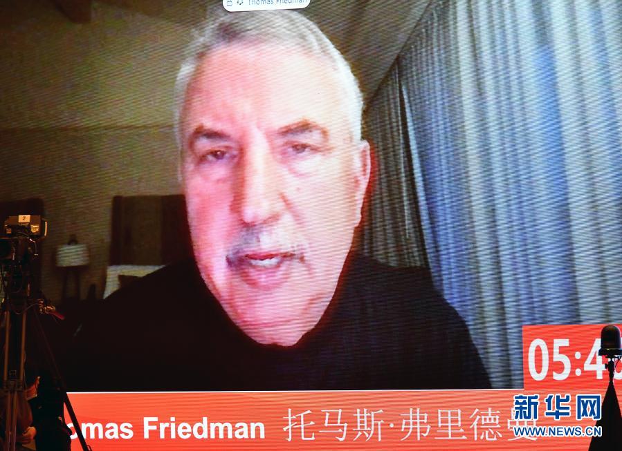 3月20日,《世界是平的》一书作者、《纽约时报》外交评论专栏作家托马斯·弗里德曼通过视频连线发言。新华社记者 李鑫 摄