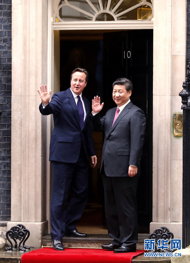 唐宁街10号,首相府。虽然21日一大早伦敦就淅淅沥沥下起小雨,仍有众多媒体提前在这里守候。微笑握手,挥手致意,习近平主席和卡梅伦首相并肩走进那扇公众熟知的大门。