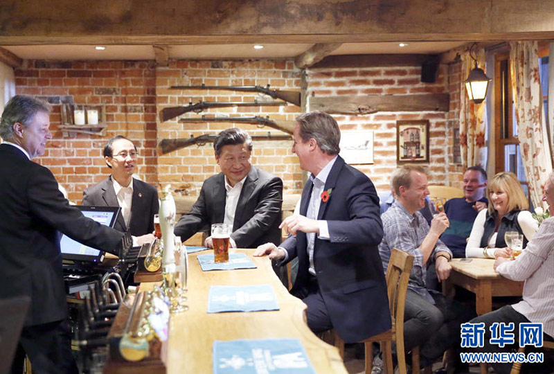华灯初上,习近平主席同卡梅伦首相在契克斯首相别墅会晤后,一起来到附近一间名叫“卡兹顿的犁”的乡村酒吧,品尝当地啤酒和炸鱼薯条。习近平主席称赞食品“Very good”,还同酒吧里的民众握手致意,亲切交流。“欢迎您到酒吧来。”一位中年男子和酒吧老板主动提出能否合影,习近平主席愉快答应,酒吧内其乐融融。短短20分钟时间,中国国家元首和英国普通民众的心拉得更近……