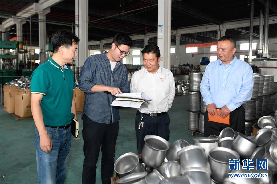 在湖州凯瑞五金电器有限公司,湖州市南太湖新区出口专班的工作人员走访出口企业,为企业主(右二)介绍政府最新扶持政策(9月29日摄)。新华社记者 黄宗治 摄
