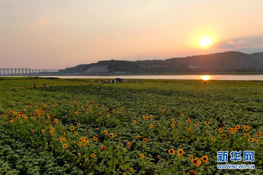 9月10日,游客在河南省三门峡市黄河岸边的油葵园内游玩(无人机照片)。新华社记者 郝源 摄