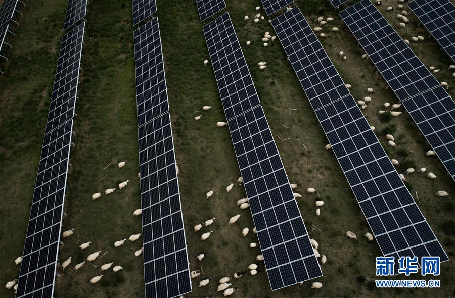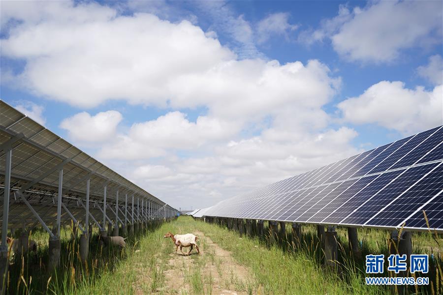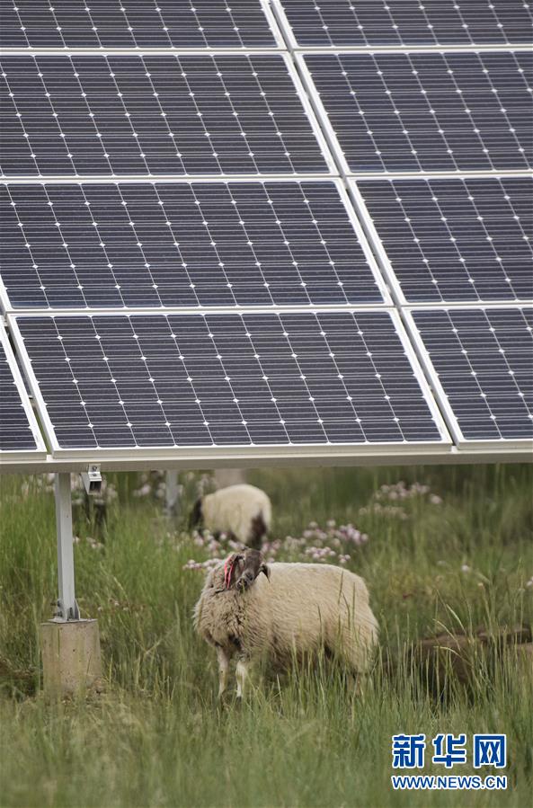 羊群在青海省海南藏族自治州光伏发电园区内吃草(2019年6月16日摄)。新华社记者 吴刚 摄