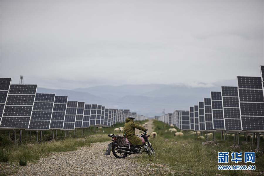 一位牧民在青海省海南藏族自治州光伏发电园区内放牧(2019年6月16日摄)。新华社记者 吴刚 摄